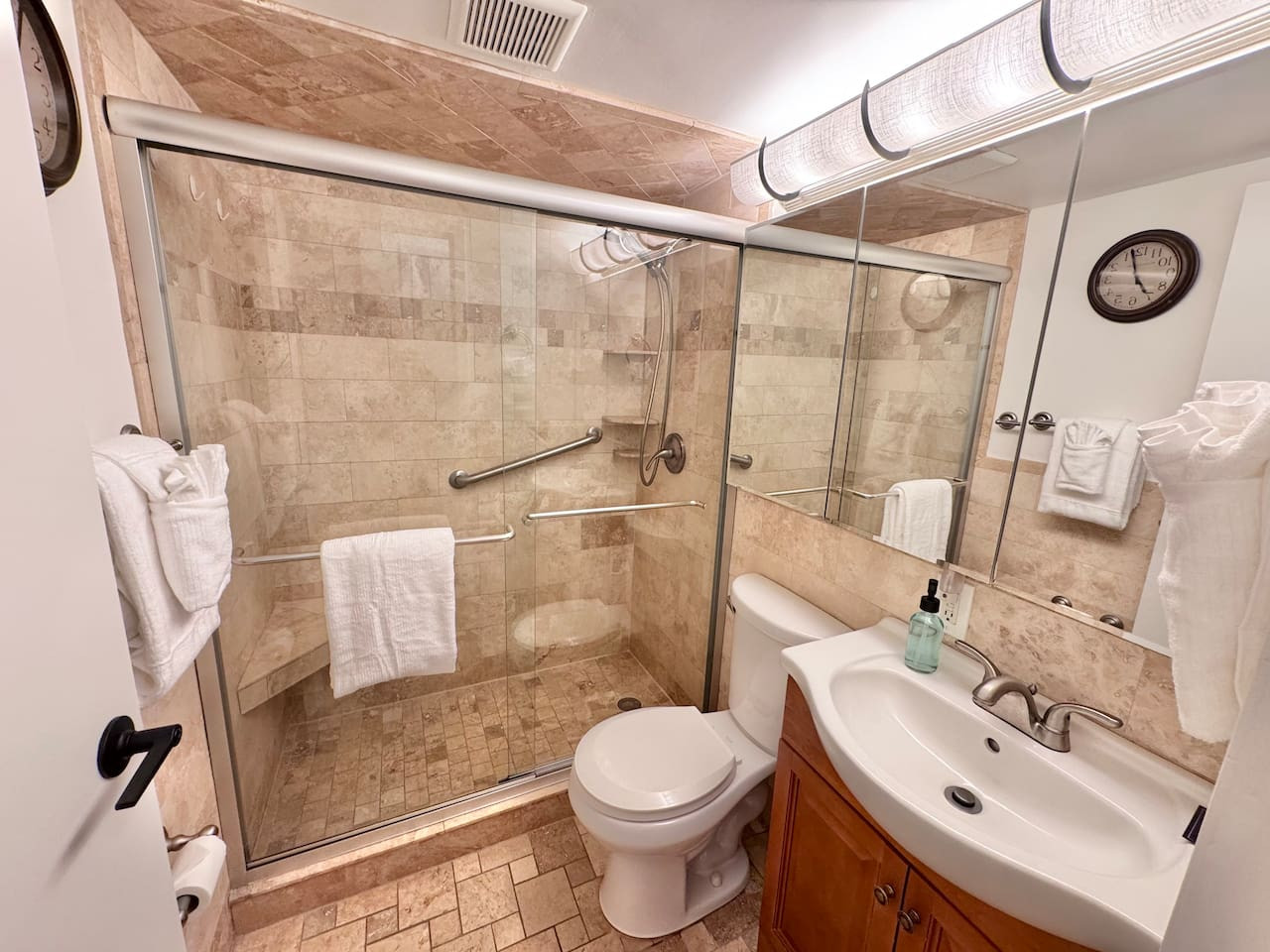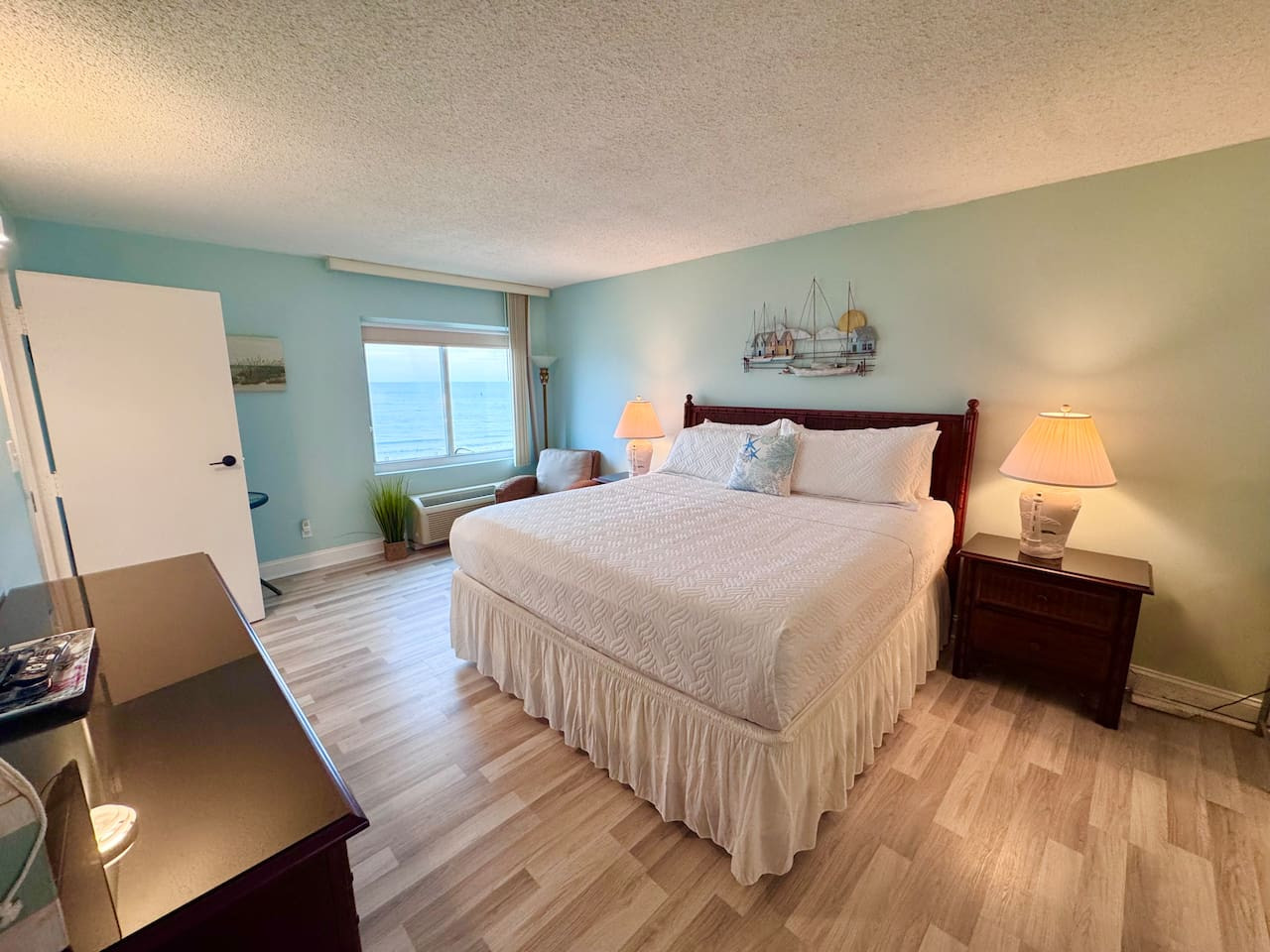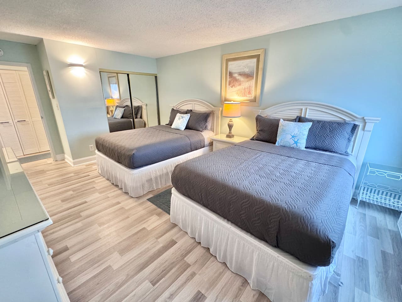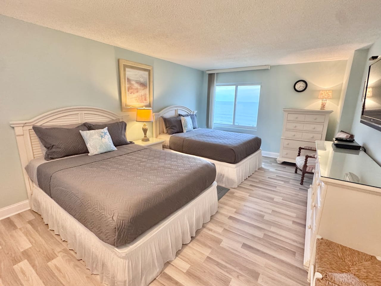 This 2-bedroom, 2-bathroom condo features 1 king bed and 2 queen beds, comfortably sleeping up to 6 guests. With 2 full bathrooms, everyone has convenient access to get ready for beach days without any wait.